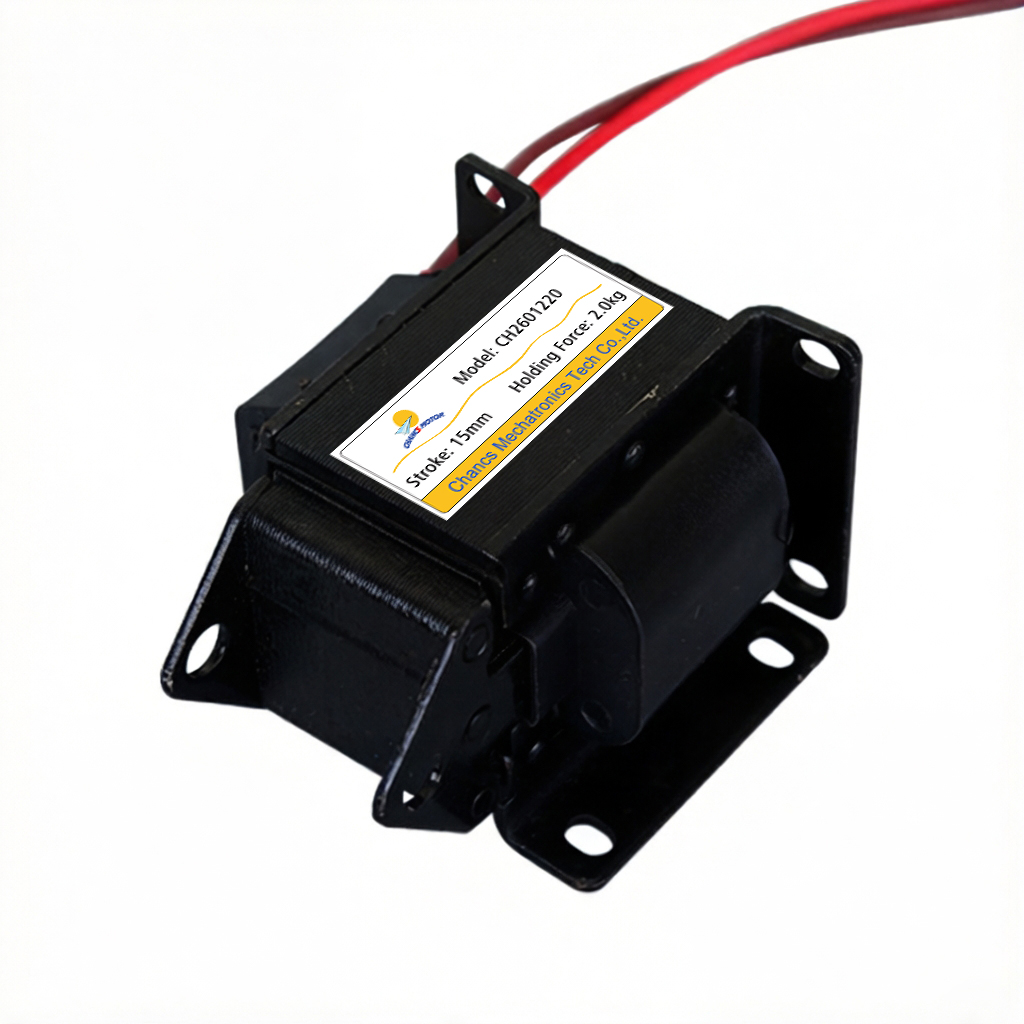The solenoid consists of two main parts: the yoke and the armature. During installation, the yoke is fixed to a stationary bracket, while the armature is connected to a linkage rod. When the coil is energized, the armature is attracted, transmitting motion via the linkage rod to actuate the controlled mechanism.